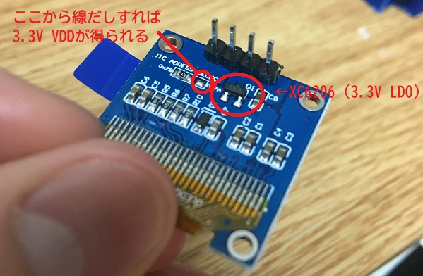 ここで、OLEDモジュールには3.3Vレギュレータが載っていますので、そこで生成された3.3Vをマイコンの電源としても使うことにしました。
